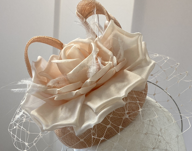 Pillbox headpiece with netting and rose detail